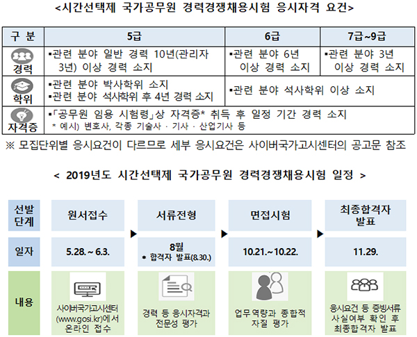 인사혁신처는 ‘2019년도 시간선택제 국가공무원 경력경쟁채용시험 시행계획’을 3일 ‘사이버국가고시센터’(http://gosi.kr)에 공고했다.