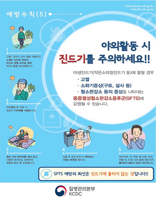 SFTS는 농작업, 등산 등 야외활동 시 진드기에 물리지 않도록 주의하는 것이 최선의 예방법이다.
