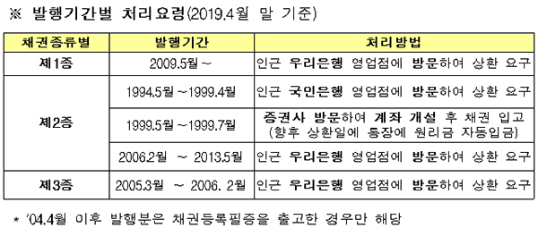 상환기일은 지났으나 소멸시효에 이르지 않은 실물 국민주택채권의 경우 언제라도 채권 발행은행에서 원리금을 받을 수 있다.