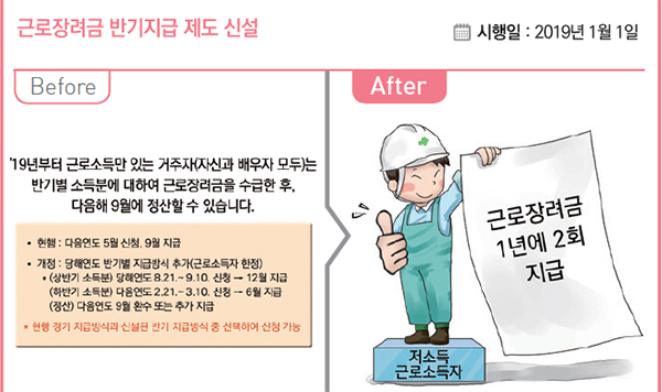 ▲근로장려금 반기지급 제도 신설=올해 하반기부터 6월과 12월 등 반기별로 근로장려금을 받을 수 있게 된다. 상반기 소득분에 대해서는 8~9월 신청해 12월에 지급하고, 하반기 소득분에 대해서는 2~3월 신청해 6월에 지급한다. 추가지급 등 정산은 다음해 9월에 한다.