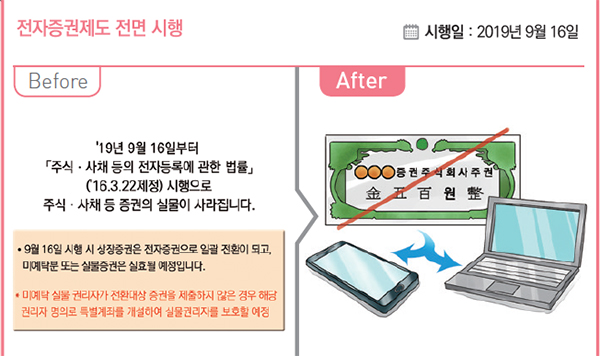 ▲전자증권제도 전면 시행=9월 16일부터 주식·사채 등 증권의 실물이 사라진다. 주식·사채 등을 전자등록해 증권의 발행·유통·권리 행사가 실물없이 이뤄지는 전자증권제가 도입되는 것이다. 이날부터 상장증권은 전자증권으로 일괄 전환되고 미예탁분·실물증권은 실효된다. 상장주식·사채 등은 전자등록을 통해서만 발행·유통되고 비상장 주식·사채 등은 발행인 등의 신청이 있는 경우 전자증권으로 전환된다.