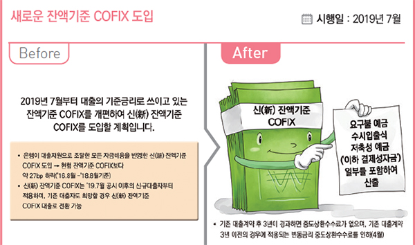 ▲새로운 잔액기준 COFIX 도입=대출의 기준금리로 쓰이고 있는 잔액기준 COFIX를 개편한다. 그동안 잔액기준 COFIX 산출시 제외돼 온 요구불예금 및 수시·입출식 저축성 예금 등 결제성 자금을 일부 포함해 산출할 계획이다. 새로운 COFIX(잔액기준)는 현행보다 27bp 정도 하락한다.
