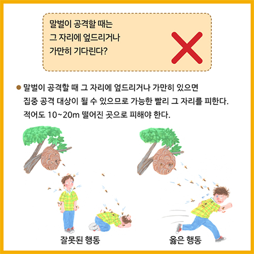 야외에서 말벌을 맞닥뜨리며 무조건 자리를 피해야 한다. 말벌에게 위협이 되는 행동을 하면 집중적인 공격대상이 될 수 있다.
