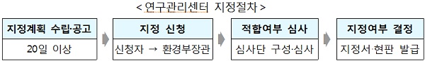 환경부 장관이 연구관리센터의 지정계획을 수립해 환경부 누리집(www.me.go.kr)에 공고하면 지정을 받으려는 자는 업무수행에 필요한 인력·시설·장비 등 지정요건을 갖춰 환경부 장관에게 지정을 신청하게 된다.