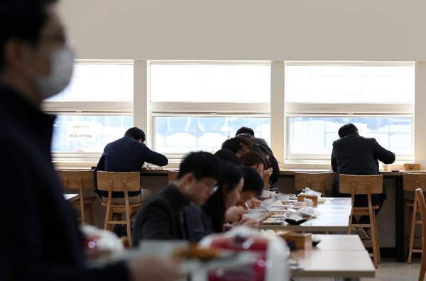 정부청사 구내식당들은 좌석배치를 변경했다. ‘사회적 거리두기’ 동참을 위해 마주보고 앉아 대화하며 식사를 하던 것에서 한 줄로 앉아 가급적 대화를 줄인 채 식사에만 집중하는 방식으로 바꿨다. 식사시간도 탄력적으로 운영하기로 했다. 넓은 구내식당을 채우는 건 식판에 부딪치는 수저소리 뿐. 배식을 위한 대기 시에도 마스크 쓰기는 필수다.