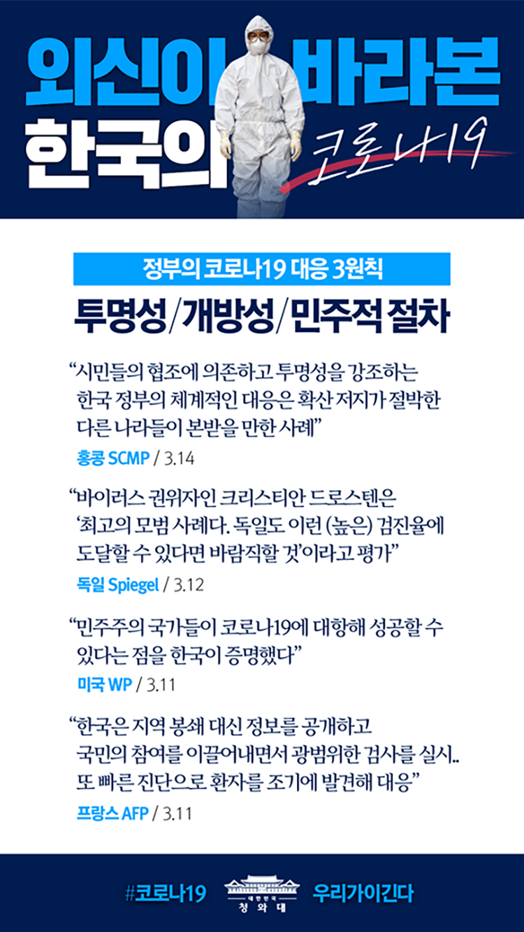 정부는 코로나19에 대해 투명성, 개방성, 민주적 절차라는 3가지 원칙에 따라 대응하고 있습니다.