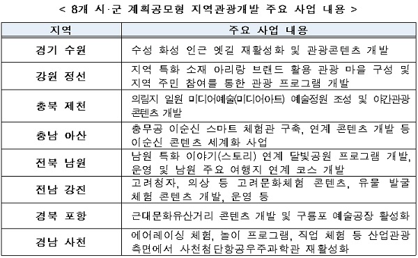 이 사업은 지자체가 지역의 노후·유휴 문화관광자원을 재활성화하고 잠재력 있는 관광개발 사업을 발굴할 계획을 제안하면 문체부가 우수한 계획을 선정해 지원하는 사업이다. 문체부는 지역별로 5년간 국비 100억 원 이내 범위에서 예산을 지원한다.