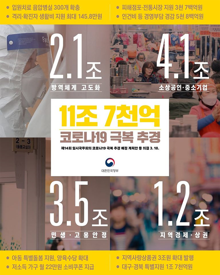 코로나19 파급 영향 최소화와 조기극복을 위한 총 11조7000억원 규모의 추가경정예산안이 편성되었어요.