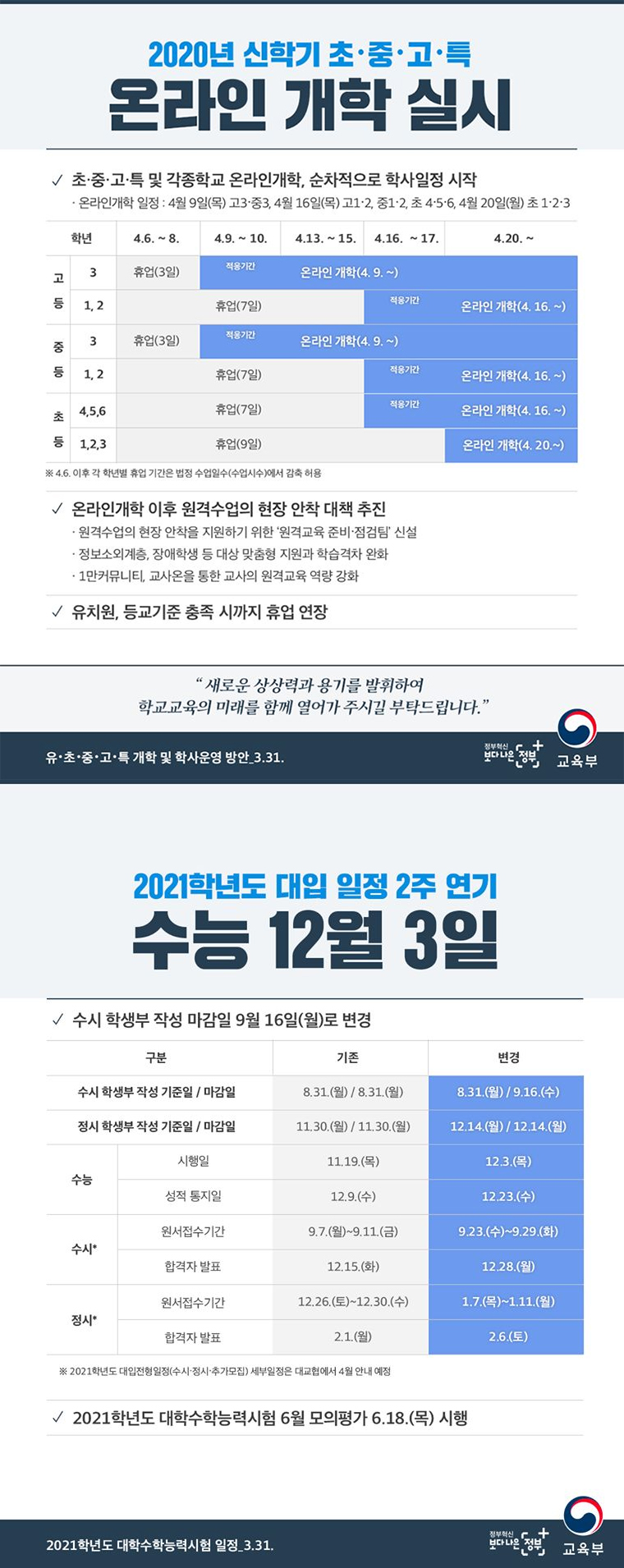 2020년 유치원을 제외한 전국 모든 초·중·고 및 특수학교, 각종학교에서 온라인 개학을 실시하고, 순차적으로 학사일정을 시작합니다.