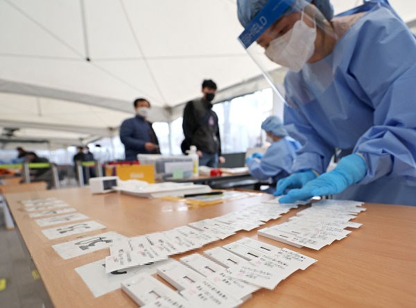 방역당국이 오는 14일부터 의료기관에서 시행 중인 전문가용 신속항원검사 결과를 추가 유전자증폭(PCR) 검사 없이 그대로 인정한다고 밝힌 11일 오전 서울광장 코로나19 임시선별검사소에서 의료진이 신속항원검사 키트를 확인하는 모습. (사진=저작권자(c) 연합뉴스, 무단 전재-재배포 금지)
