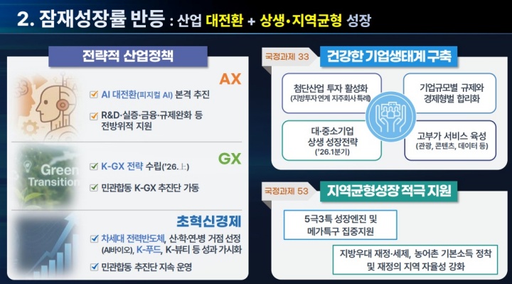 공공기관 혁신도 강화해 공기업 초혁신 프로젝트를 통해 디지털 전환과 자동화를 확대하고, 중대재해 발생 시 기관장 해임이 가능하도록 법적 근거를 명확히 하는 한편, 유사·중복 기능 조정과 통폐합 등 구조개혁도 추진한다.