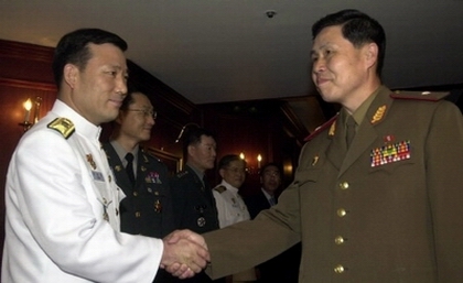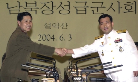 | 일정을 넘겨가며 4일 새벽까지 밤샘 협상을 벌인 제2차 남북장성급군사회담에서 남측 수석대표 박정화 해군 준장과 북측 대표 안익산 인민무력부 소장이 합의서에 서명한 후 악수하고 있다. |