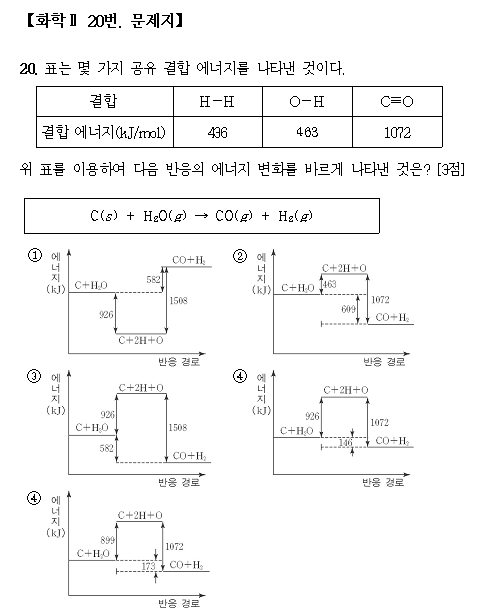 평가원은 과학탐구영역 화학Ⅱ 20번 문항은 ‘수성가스 생성반응에서의 에너지 변화를 제시된 자료에 근거해 추론하는 문제’로, 문제 풀이 과정의 문제점은 없지만, 문항내용이 과학적 사실과 부합되지 않아 수험생이 잘못 해석할 가능성이 있어 모두 정답 처리키로 했다고 설명했다.