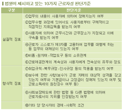 법원은 대법원 1994. 12. 9. 선고 94다22859 판결에서 근로기준법상 근로자에 해당하는지의 판단기준으로 10가지 지표를 제시한 이후 이를 계속 인용하고 있다.