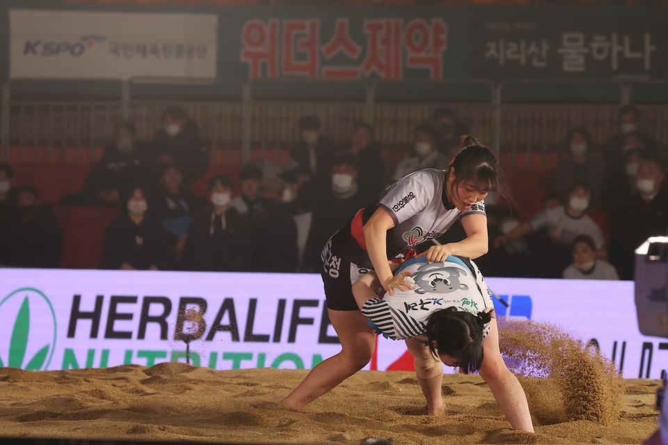 • 전남 영암군 영암실내체육관에서 ‘2023 설날장사씨름대회’ 여자부 장사결정전이 열리고 있다. 이날 선채림(구례군청), 엄하진(구례군청), 이다현(거제시청) 선수가 여자부 장사에 등극했다.