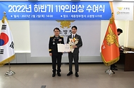 • 남화영 소방청장 직무대리가 2일 세종시 소방청에서 열린 ‘2022년 하반기 119의인상 수여식’에서 박종연 시민 영웅에게 119의인상을 수여하고 있다.