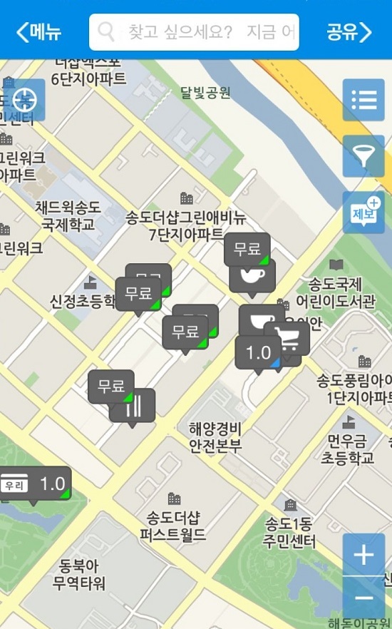 앱 화면을 보면 주변(인천 송도 센트럴파크)의 주차공간과 1시간 기준 요금 정보를 함께 확인할 수 있다. 참고로 네모 칸에 있는 세모 박스는 3가지 색깔로 구분된다. 녹색은 무료주차장, 파란색은 유료주차장, 보라색은 공유주차장을 말한다.