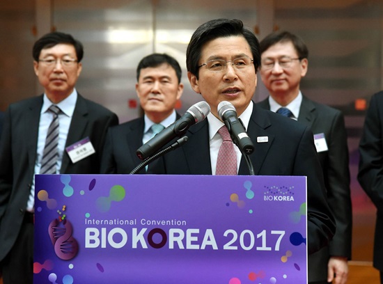 ‘바이오 코리아 2017’에서 황교안 권한대행이 축사를 하고 있다. |