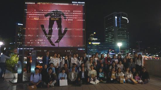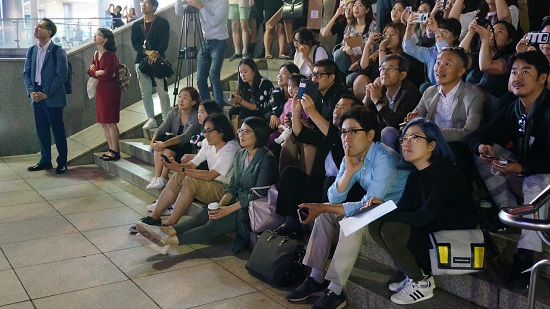 실내에서 행사를 마치고 밖으로 나와 작가들과 함께 참가자들은 모두 서울스퀘어가 바라다 보이는 서울역 계단에 옹기종기 모여 앉았다. 마치 소풍 나온 아이들마냥 기대에 차서 첫 상영 시간을 기다렸다.