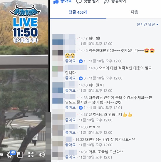 11월 10일은 전날 고민정 부대변인이 미리 예고했듯 비행기 안에 있을 시간이라 ‘11시 50분 청와대입니다’는 박수현 대변인이 진행했습니다. 생방송이라 ① LIVE 표시가 뜨면서 현재 몇 명이 접속해서 라이브 영상을 보고 있는지? 알 수 있고요. ② 계속 실시간으로 공감한다는 하트와 좋아요의 표시가 지속적으로 화면에 나타나는 것을 볼 수 있습니다.