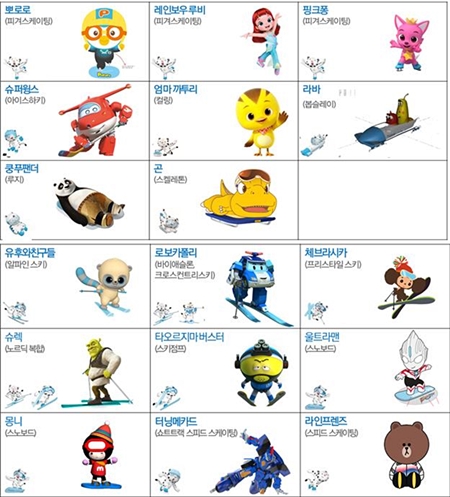 ‘캐릭터 윈터월드 페스티벌’에 등장하는 국내외 인기 캐릭터들 17종과 이들이 홍보하는 평창동계올림픽 종목.(출처=문화체육관광부) |