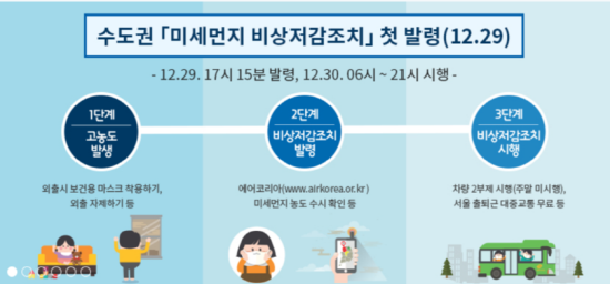 이와 관련해 민간 참여를 독려하기 위해 서울시의 경우 대중교통을 무료로 이용할 수 있도록 했다. 미세먼지의 대부분은 중국에서부터 비롯되지만 겨울철에는 일부 대기정체로 인한 국내요인으로 미세먼지 농도가 짙어지는 경우도 있다.