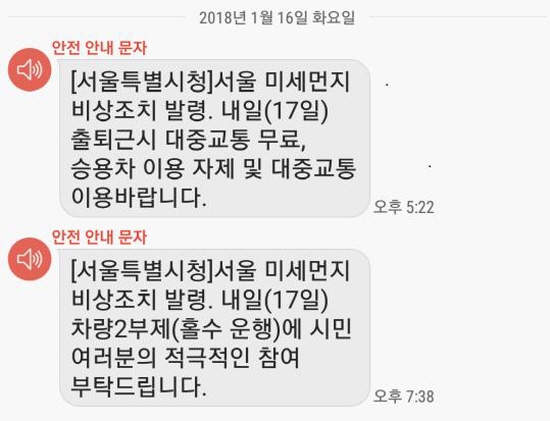 ‘미세먼지 비상저감조치’의 효과를 거두기 위해 ‘재난안전문자’를 통해서도 협조를 구하고 있다. |
