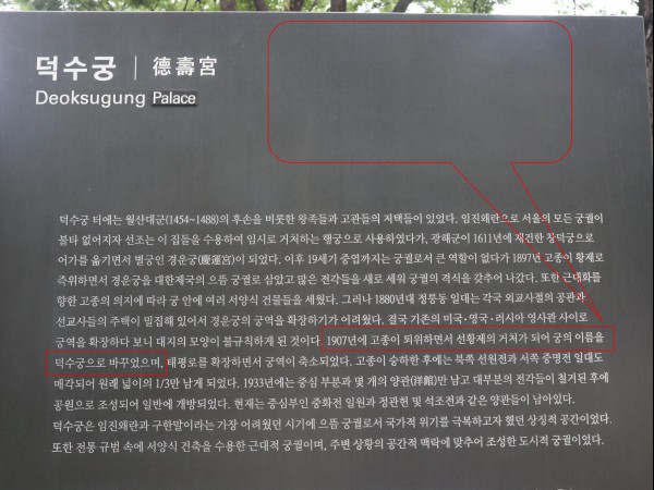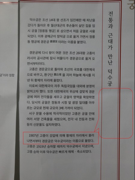 안내판과 관람정보 안내문의 내용이 똑같이 일치하지 않는다. 물론 덕수궁의 역사를 서술한 사실적인 내용이어서 내용이 다르진 않다. 하지만 안내판과 관람정보 안내문의 내용이 일치해야만 관람객들의 혼란을 막을 수 있다. 굳이 다르게 서술할 필요가 있었을까 라는 의문이 생긴다.