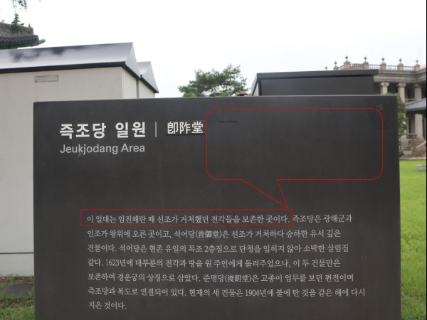 ‘즉조당’ 안내판의 일부를 인용하면, ‘이 일대는 임진왜란 때 선조가 거처했던 전각들을 보존한 곳이다’라고 나와 있다. ‘즉조당’은 발음하기도, 한자의 뜻을 유추하기도 어렵다. 첫 줄에 ‘즉조당’도 어려운데 거기다 ‘전각’이란 단어까지 등장하니 독해의 어려움이 가중된다.
