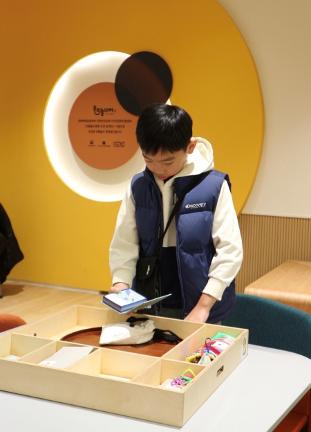 다양한 전통놀이 종류를 살펴보고 있는 아이의 모습.