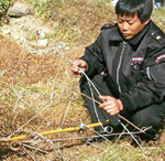 | 대한수렵관리협회 밀렵감시단 회원이 철제덫과 용수철, 와이어를 수거하고 있다. |