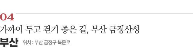 부산 금정산은 27개 지정 등산로 외에 주민들이 찾는 샛길을 포함하면 무려 100여 개 진입로가 있다고 한다. 그만큼 일상 가까이, 언제든 가볍게 오르기 좋은 산이다. 금정산성(사적)은 금정산 꼭대기에서 동남쪽·서남쪽 능선과 계곡을 따라 축성했으며, 둘레 1만 8845m로 우리나라에서 규모가 가장 크다. 그만치 코스도 다양하다.