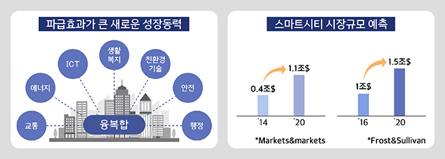 ![[파급효과가 큰 새로운 성장동력] 융복합 - 교통, 에너지, ICT, 생활복지, 친환경기술, 안전, 핸정 / [스마트시티 시장규모 예측] ▶Market&markets '14년 0.4조$ '20년 1.1조$ ▶Frost&Sullivan '16년 1조$, '20년 1.5조$](https://www.korea.kr/newsWeb/resources/temp/images/000113/20190808e05.jpg)